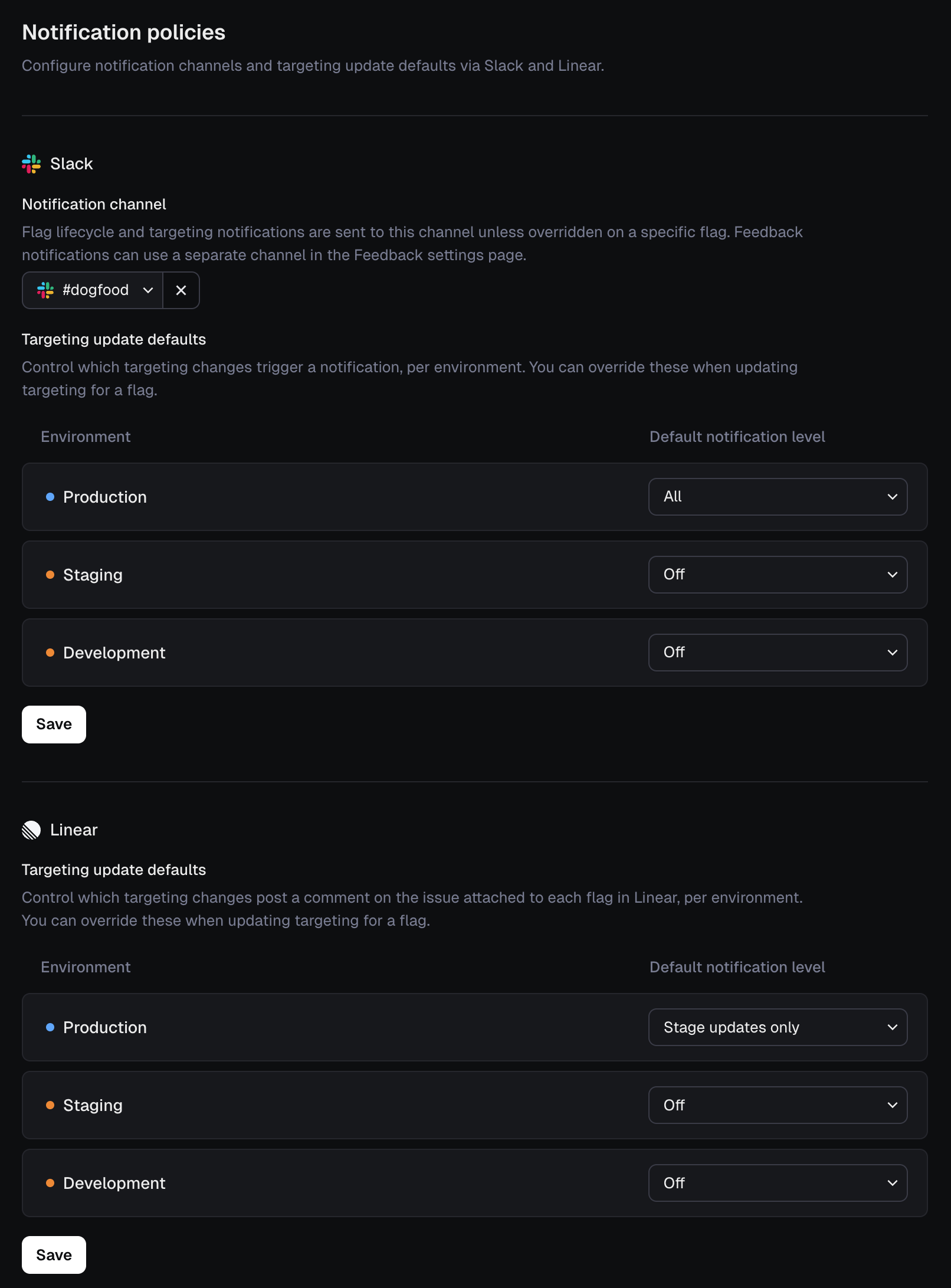 It gives you one place to control how Reflag posts targeting updates to Slack and Linear by default.